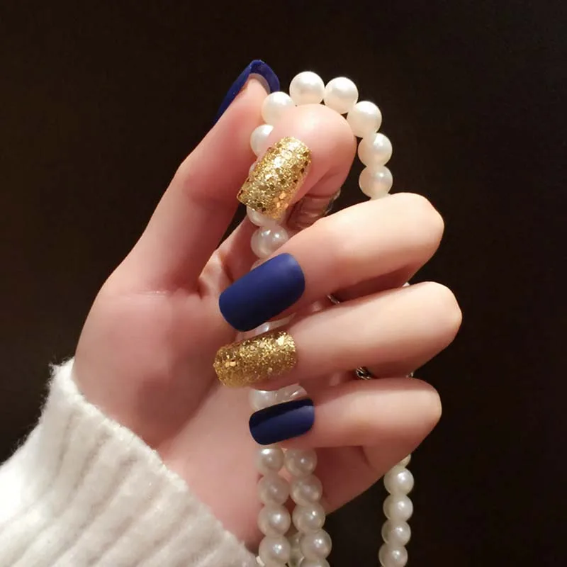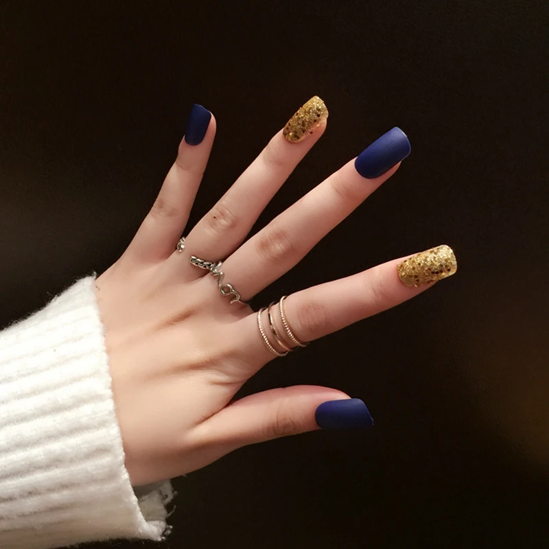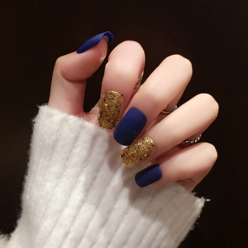 Special Offer 24 Sztuk Złota Design Z Cekinami Paznokcie Matowe Ciemny Niebieski Sztuczny Paznokieć Shimmer Glitter UV Fałszywe Paznokcie Z352 Discount 25% Today!