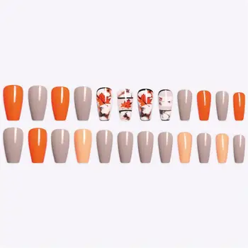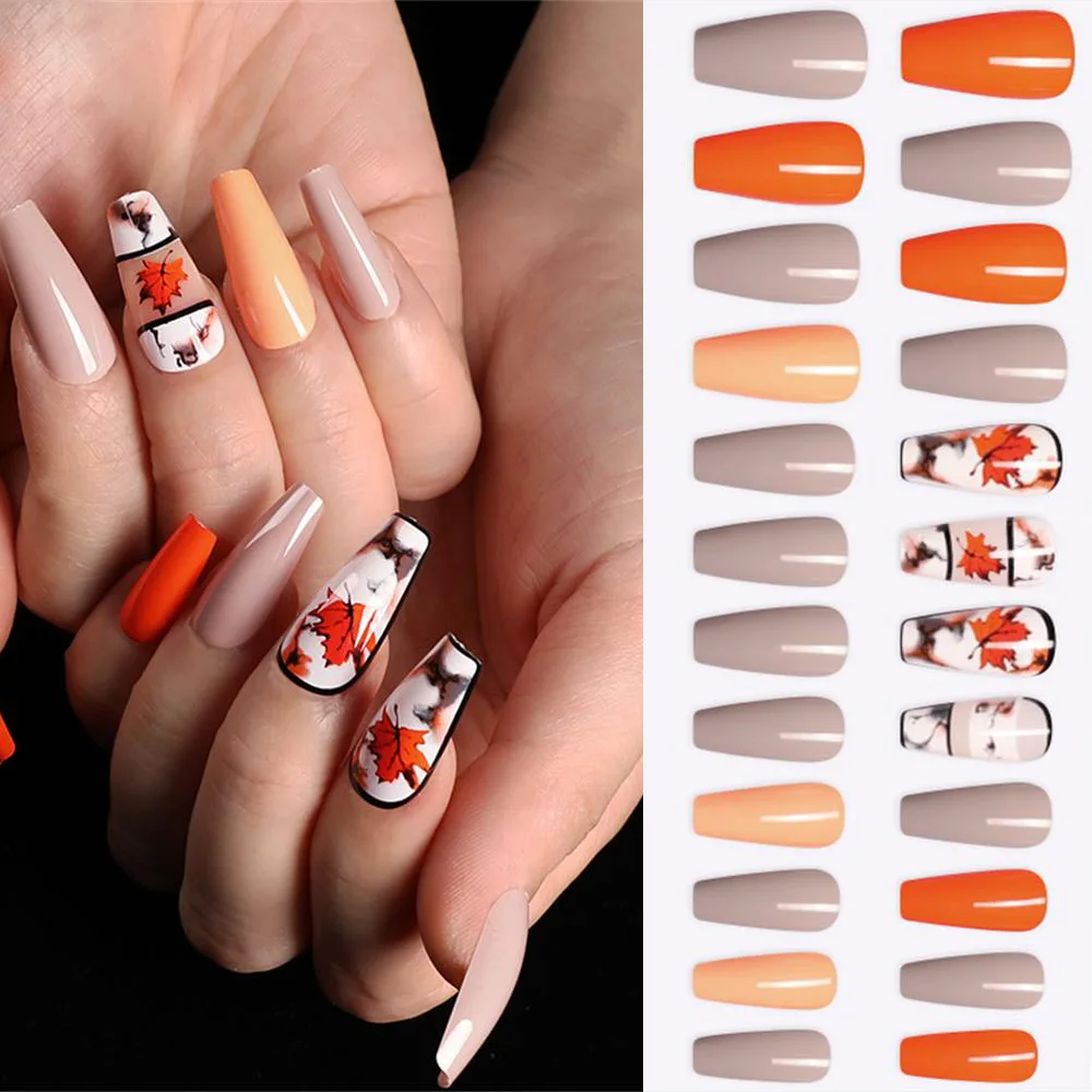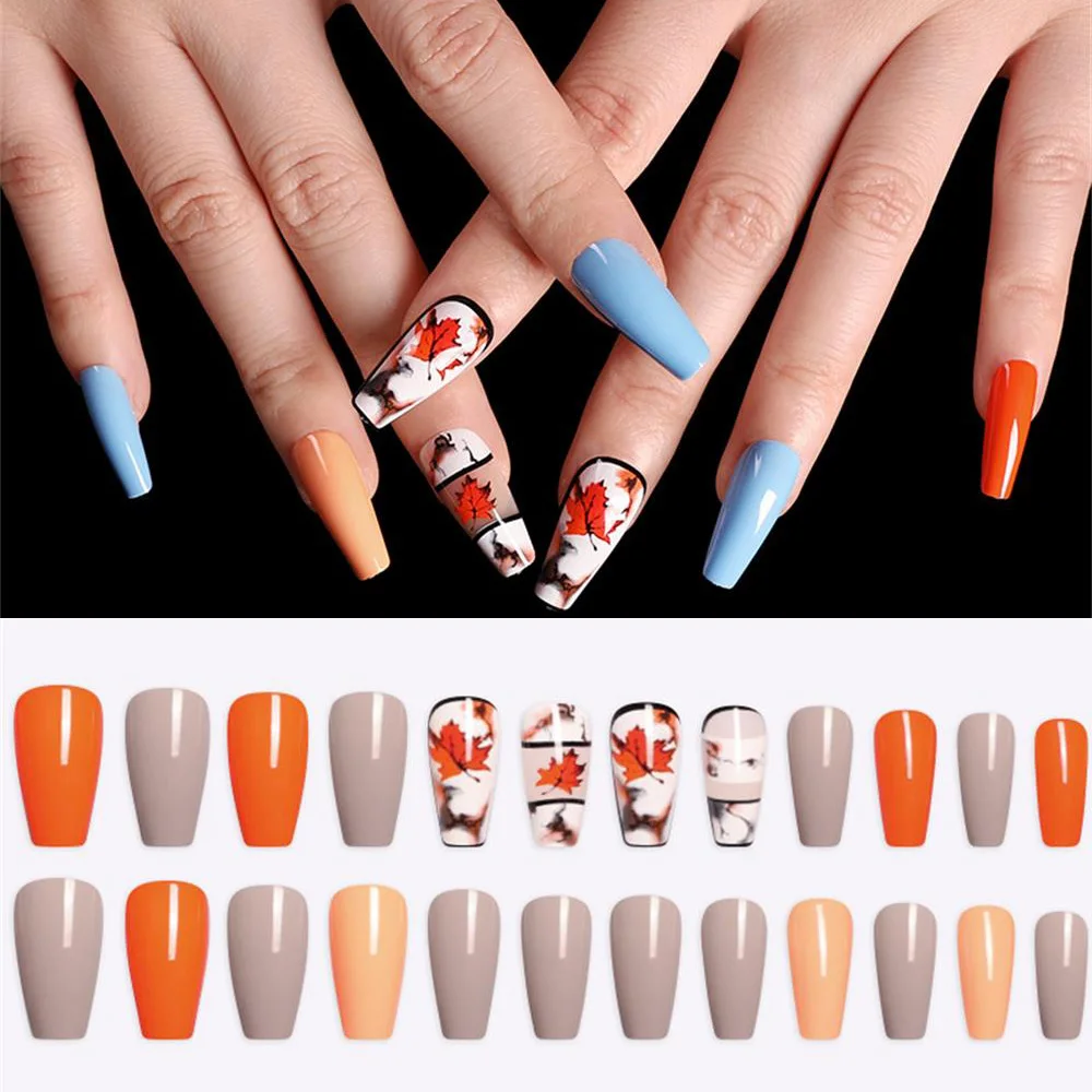 Special Offer 24 Sztuk/pudło Wzór Klonowego Liścia Fałszywe Paznokcie Baleriny Trumny Sztuczne Paznokcie Długie Szpilki Naciśnij Na Paznokcie Akrylowe Fałszywe Tipsy Discount 33% Today!